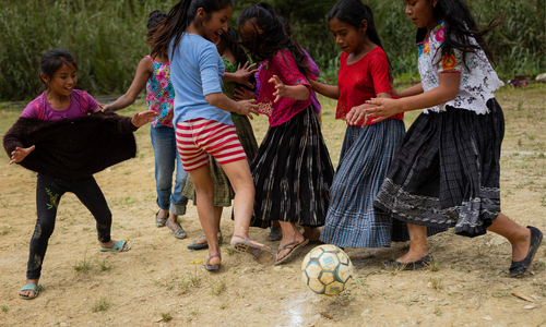 In San Juan Chamelco, Guatemala, a group of girls laugh as they chase a football around the dirt field.